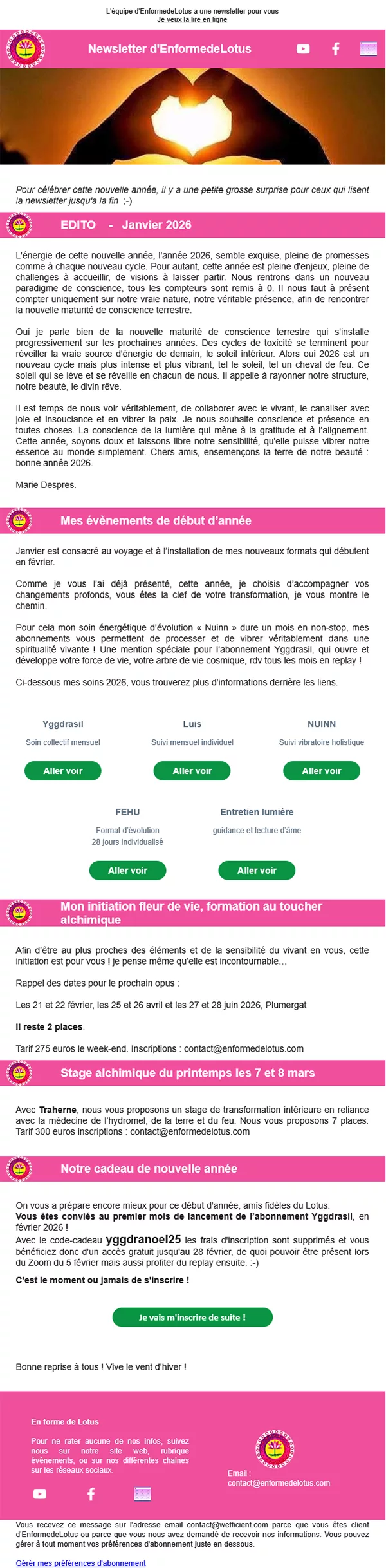 La newsletter d’EnformedeLotus est enfin disponible. Tous les mois vous retrouverez :